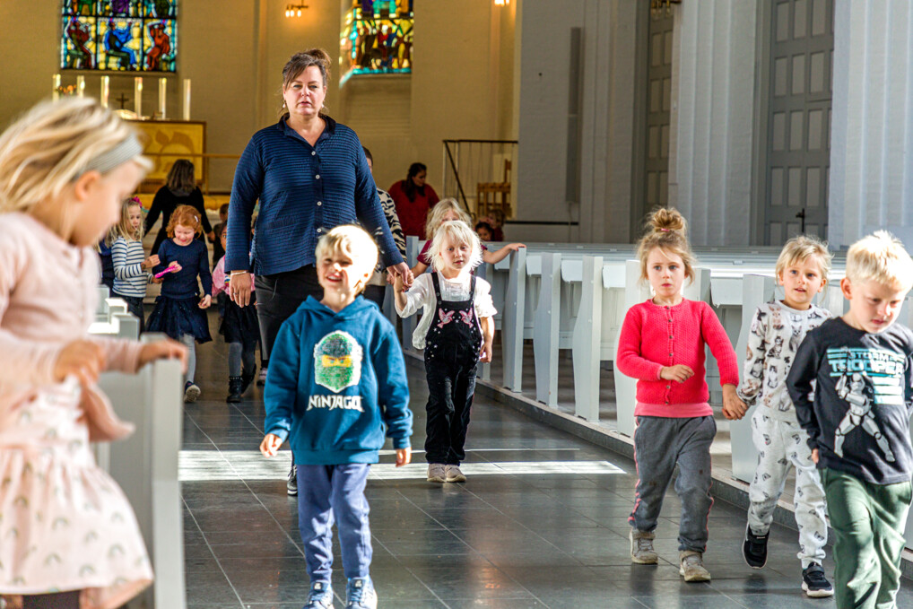 Måske kan man skimte kirketårnet fra børnehaven. Måske har man set præsten øse vand på hovedet af et lille barn til en dåb, og måske har man lagt en krans ved en bedsteforælders gravsten på kirkegården. Men ellers er kirken for mange børnehavebørn ukendt land. Det har Børnetjenesten de seneste år forsøgt at rode bod på ved at invitere de ældste børnehavebørn ind og udforske den lokale kirke.