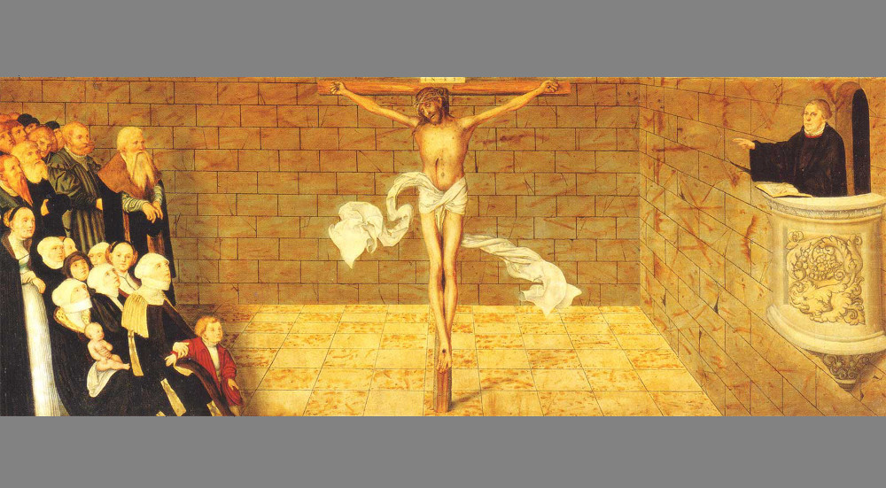 "Luther prædiker", Lucas Cranach d. Yngre, 1547. Kristus er i centrum for forkyndelsen. Menigheden består af folk i alle aldre, og billedet fortæller, at de alle lytter andægtigt til Luthers prædiken.