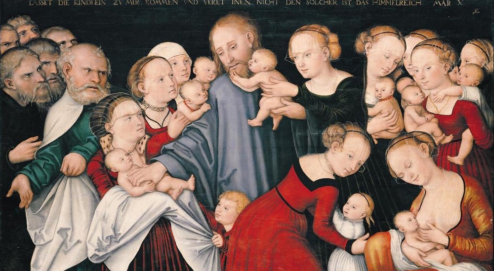 "Kristus velsigner børnene", Lucas Cranach d. Yngre, 1546. Øverst står: "Lad de små børn komme til mig, det må I ikke hindre dem i, for Guds Rige er deres." (Mark. 10.